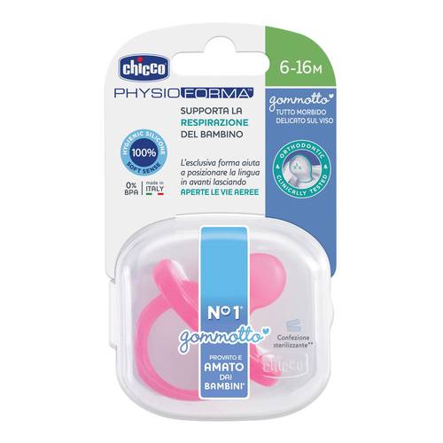 chicco PHYSIO GommottoRosa Descrizione Succhietto Gommotto in silicone, disegnato in modo da non disturbare il bambino neppure durante la nanna: - extra morbido e gentile sulla pelle; - come il seno materno: la base morbida e sottile permette alle labbra di chiudersi naturalmente; - fori di ventilazione: permettono il passaggio dell’aria e riducono il ristagno di saliva; - Tettina Active in Silicone: il silicone è un materiale trasparente e igienico, è insapore e inodore e non si deforma nel tempo. Età consigliata: 6-12 mesi Formato La confezione contiene 1 succhietto Gommotto. Cod. 0007301311000